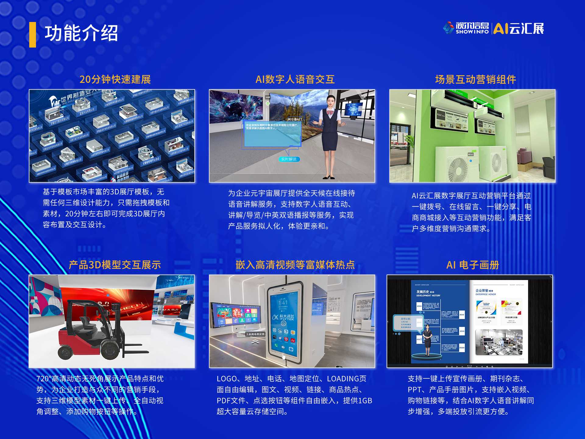 视尔AI云汇展以VR全景+3D展厅模板的方式搭建在线营销场景的SaaS平台,为广大工业制造业企业提供先进、易用的数字化展厅、数字虚拟员工和3D互动营销解决方案,为实体企业提供元宇宙展厅一键搭建、产品三维模型交互展示、AI数字员工语音讲解、线上沟通与商洽联系等营销服务,为企业打造7*24无间断的元宇宙展览与展示空间,解决制造、机械、医药、工业、汽车零部件等实体行业数字营销能力薄弱的弊端,助力实体企业实现数字化转型。