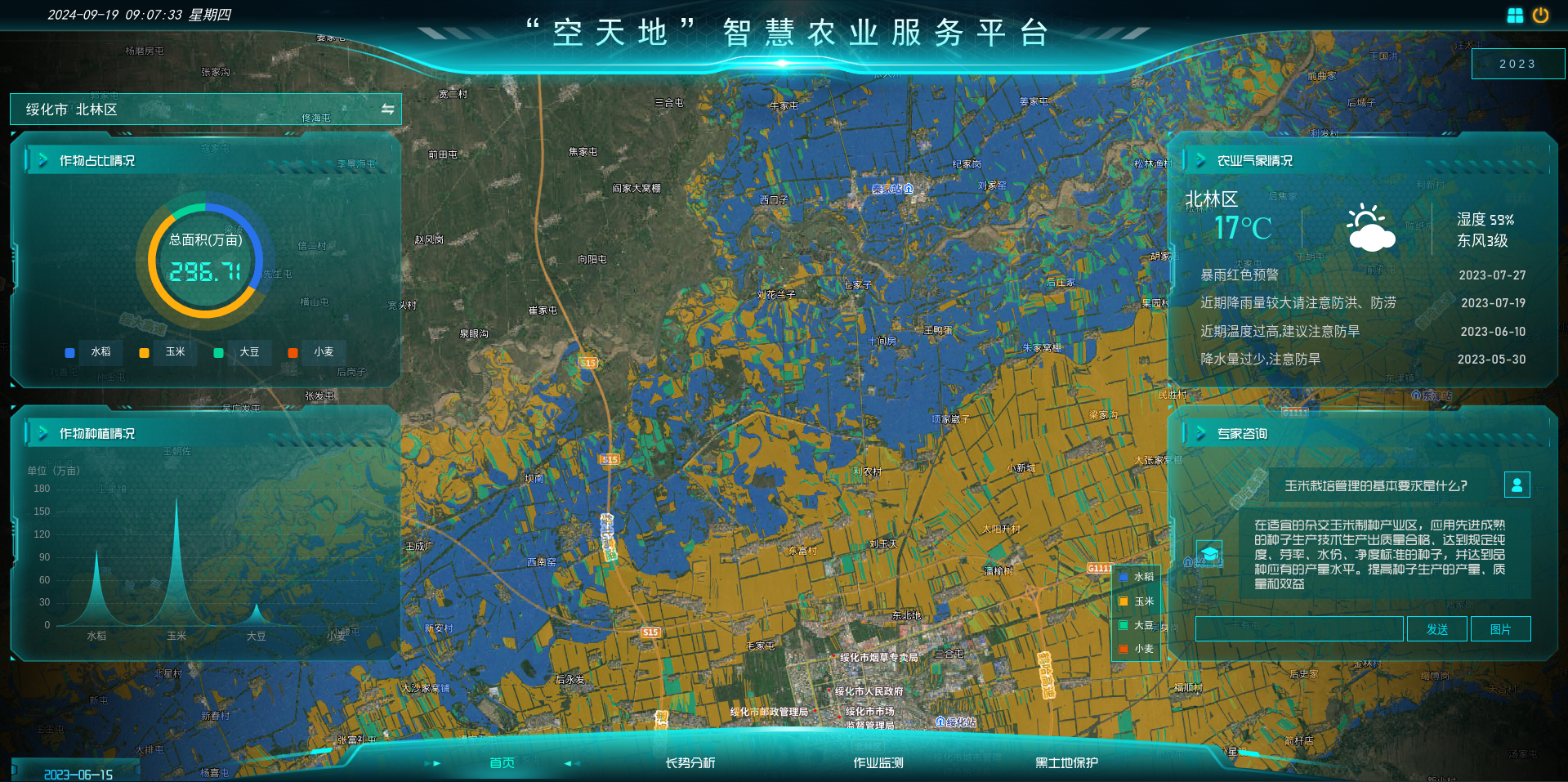 今年以来,绥化市通过对农业遥感及物联网数据的深入分析,为农业主管部门提供种植结构、作物长势、灾情损失、粮食产量、补贴资金预测分析的“图”向导,为农业决策提供科学依据。