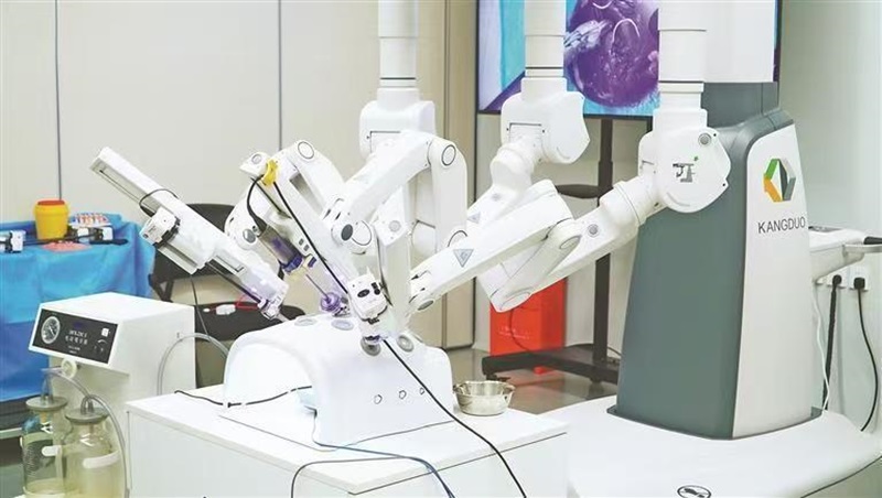 哈尔滨思哲睿自主研制的康多手术机器人在作业中。记者 彭溢摄