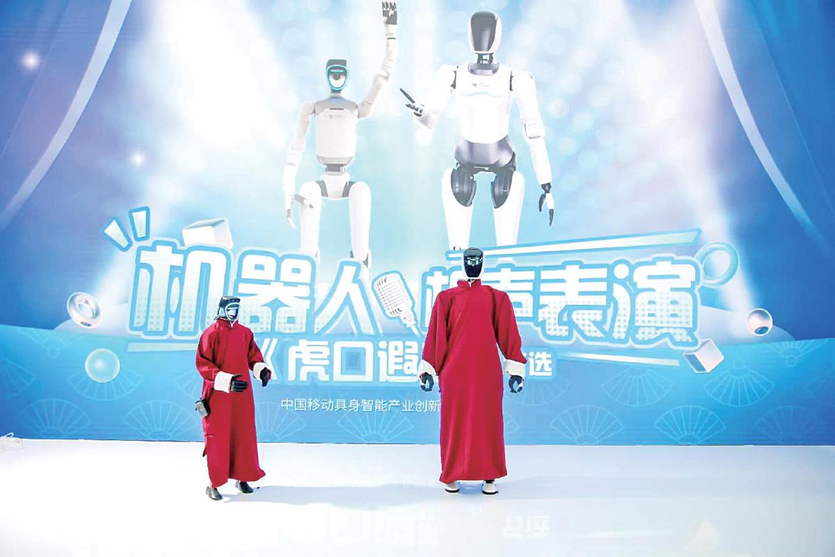 在第八届数字中国建设峰会期间,中国移动全尺寸人形机器人和小尺寸人形机器人“灵犀”为现场观众带来别开生面的相声表演。它们搭载了中国移动自主研发的协同控制系统,机器人通过多机互联的协议传输指令,将对话衔接误差控制在2秒内,实现机器人之间“心灵感应”。