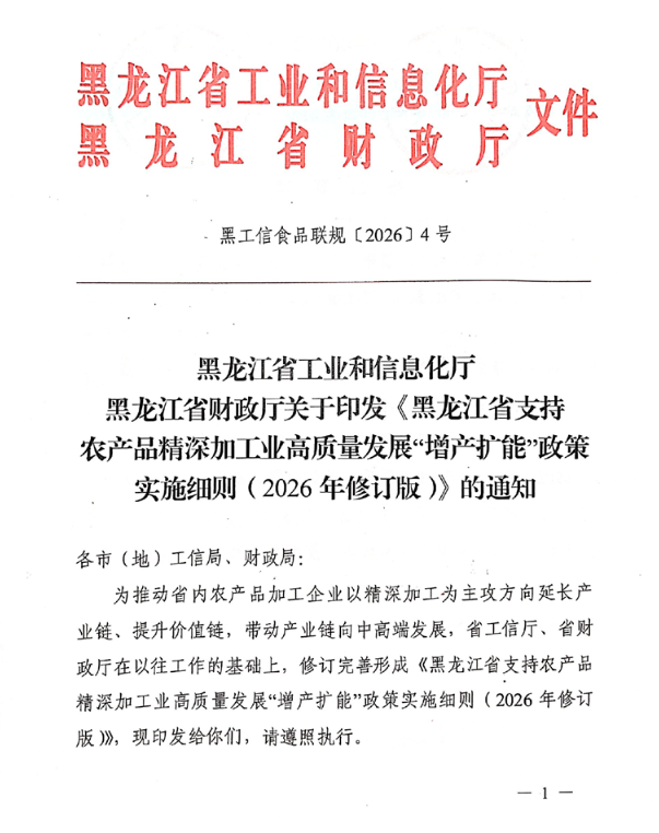 关于印发《黑龙江省支持农产品精深加工业高质量发展“增产扩能”政策实施细则(2026年修订版)》的通知
