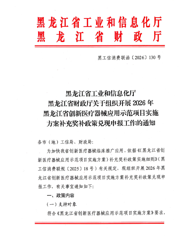 关于组织开展2026年黑龙江省创新医疗器械应用示范项目实施方案补充奖补政策兑现申报工作的通知