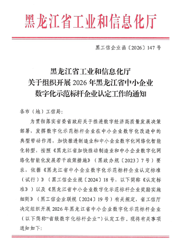 关于组织开展2026年黑龙江省中小企业数字化示范标杆企业认定工作的通知