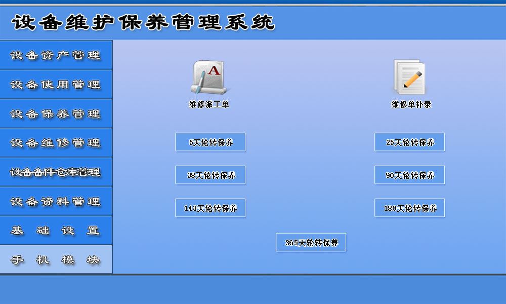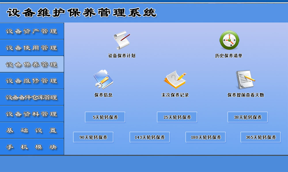 3、设备保养管理: 包括设备保养计划、保养信息、历史保养清单、5天轮转保养、25天轮转保养、38天轮转保养、90天轮转保养、143天轮转保养、末次保养记录等。设置首次保养时间,软件将自动轮转提醒保养。