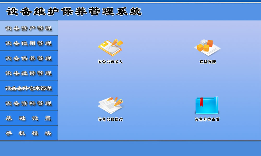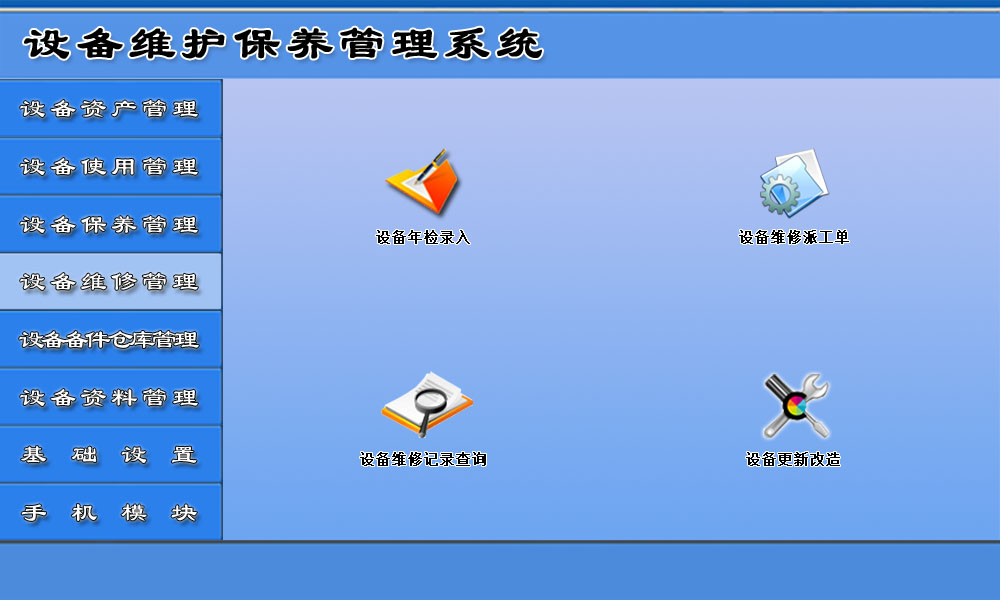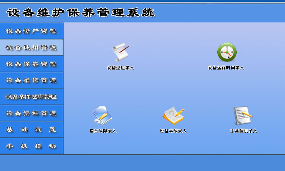 系统的主要项目概括为:设备资产管理、设备使用管理、设备保养管理、设备维修管理、设备备件仓库管理、设备资料管理、基础设置和手机模块,对设备的状况进行了全面管理,有利于用户了解设备的最新状态,提供工作效率。