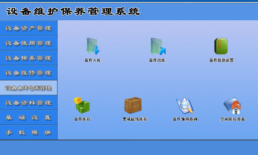 5、设备备件仓库管理: 主要包括:备件信息设置、备件入库、备件出库、备件库存、备件领用查询、空闲库位查看等。