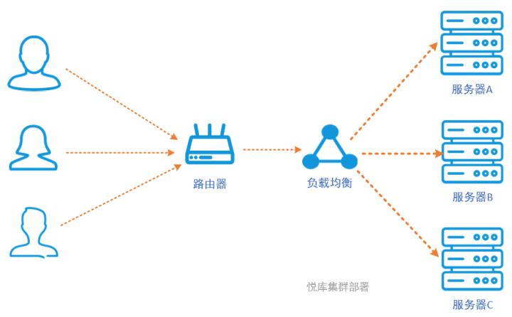 通过使用多台服务器,进行集群化部署,利用负载均衡机制分散处理原单台服务器的访问压力,集群化服务器访问图例: