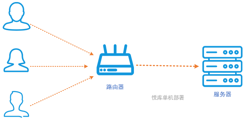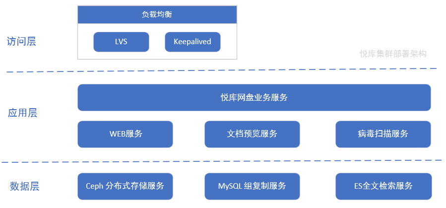 悦库部署架构,自上而下由三个层面组成,分别为访问层、应用层、数据层。