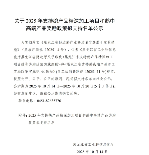 关于2025年支持鹅产品精深加工项目和鹅中高端产品奖励政策拟支持名单公示