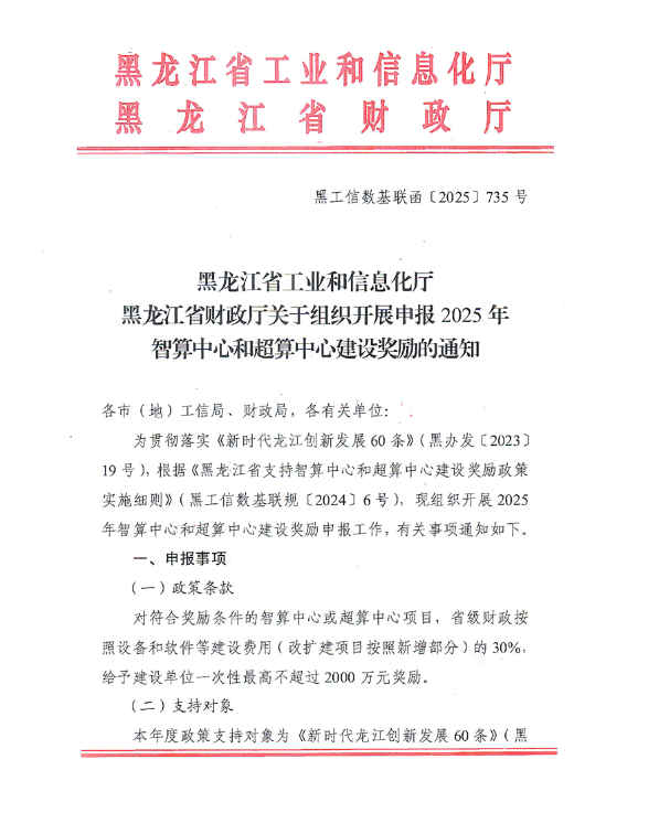黑龙江省工信厅 黑龙江省财政厅关于组织开展申报2025年智算中心和超算中心建设奖励的通知