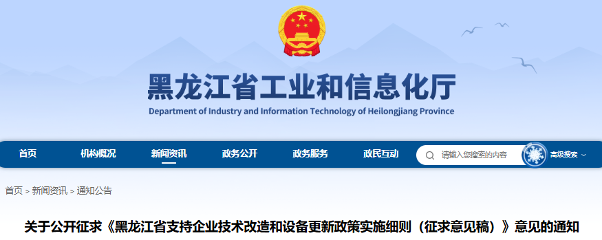 关于公开征求《黑龙江省支持企业技术改造和设备更新政策实施细则(征求意见稿)》意见的通知