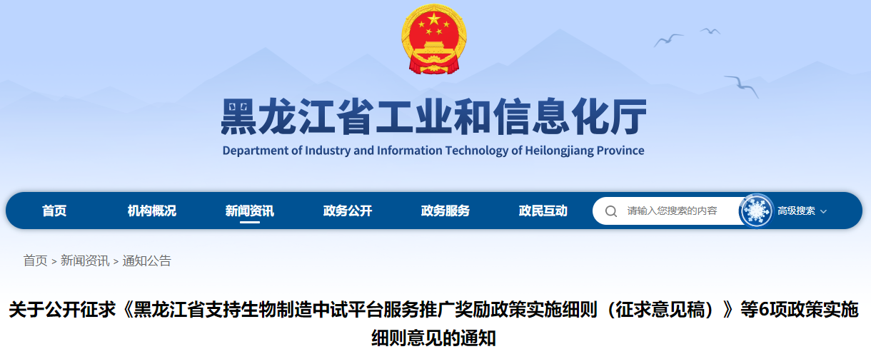 关于公开征求《黑龙江省支持生物制造中试平台服务推广奖励政策实施细则(征求意见稿)》等6项政策实施细则意见的通知