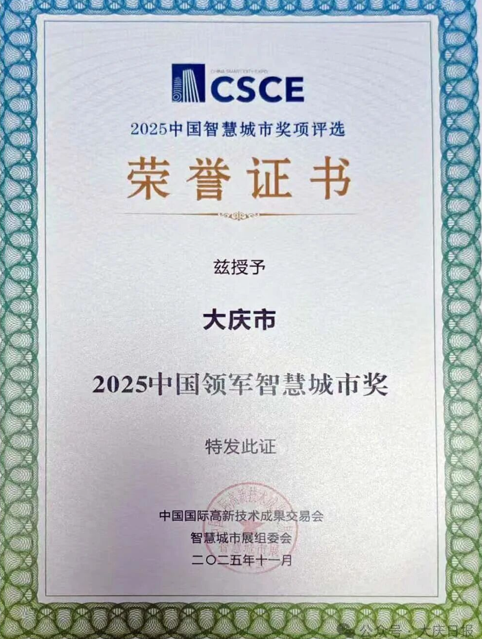 11月15日,第二十七届中国国际高新技术成果交易会“2025亚太智慧城市评选颁奖典礼”在深圳落幕。大庆市凭借卓越的智慧城市建设成效,第四次斩获“中国领军智慧城市”奖,成为本届评选中东北地区唯一上榜城市。